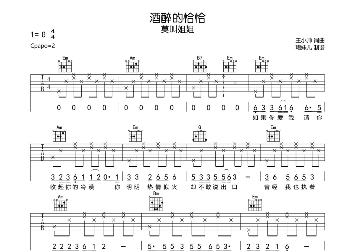 《酒醉的恰恰》是莫叫姐姐演唱的一首歌曲,本吉他谱采用的是G调指法编配,这份吉他谱共有两张高清图谱,图谱由 @珺妹儿 编配上传,图谱使用六线谱编配,包含吉他和弦指法、简谱以及歌词部分,使用这份酒醉的恰恰吉他谱,可以让你更加方便地掌握这首歌曲的弹唱技巧,快来尝试吧。本谱采用G调指法编配,弹唱建议变调夹2品,速度85BPM,难度较简单,易上手。