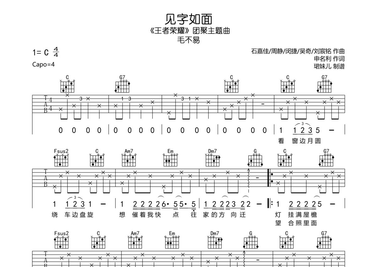 毛不易/王者荣耀《见字如面》吉他谱 - C调弹唱六线谱