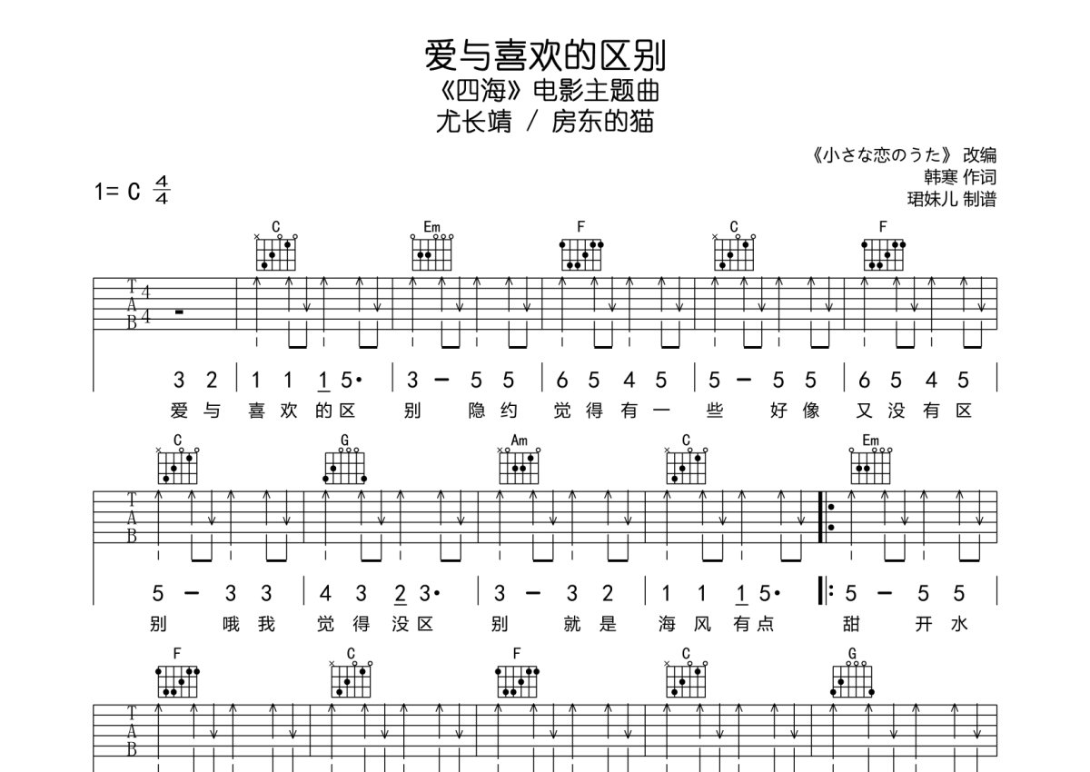 《爱与喜欢的区别》是尤长靖 / 房东的猫演唱的一首歌曲,本吉他谱采用的是C调指法编配,这份吉他谱共有六张高清图谱,图谱由 @珺妹儿 编配上传,图谱使用六线谱编配,包含吉他和弦指法、简谱以及歌词部分,使用这份爱与喜欢的区别吉他谱,可以让你更加方便地掌握这首歌曲的弹唱技巧,快来尝试吧。电影《四海》主题曲,本谱采用C调指法编配,速度180BPM,难度较简单,易上手。
