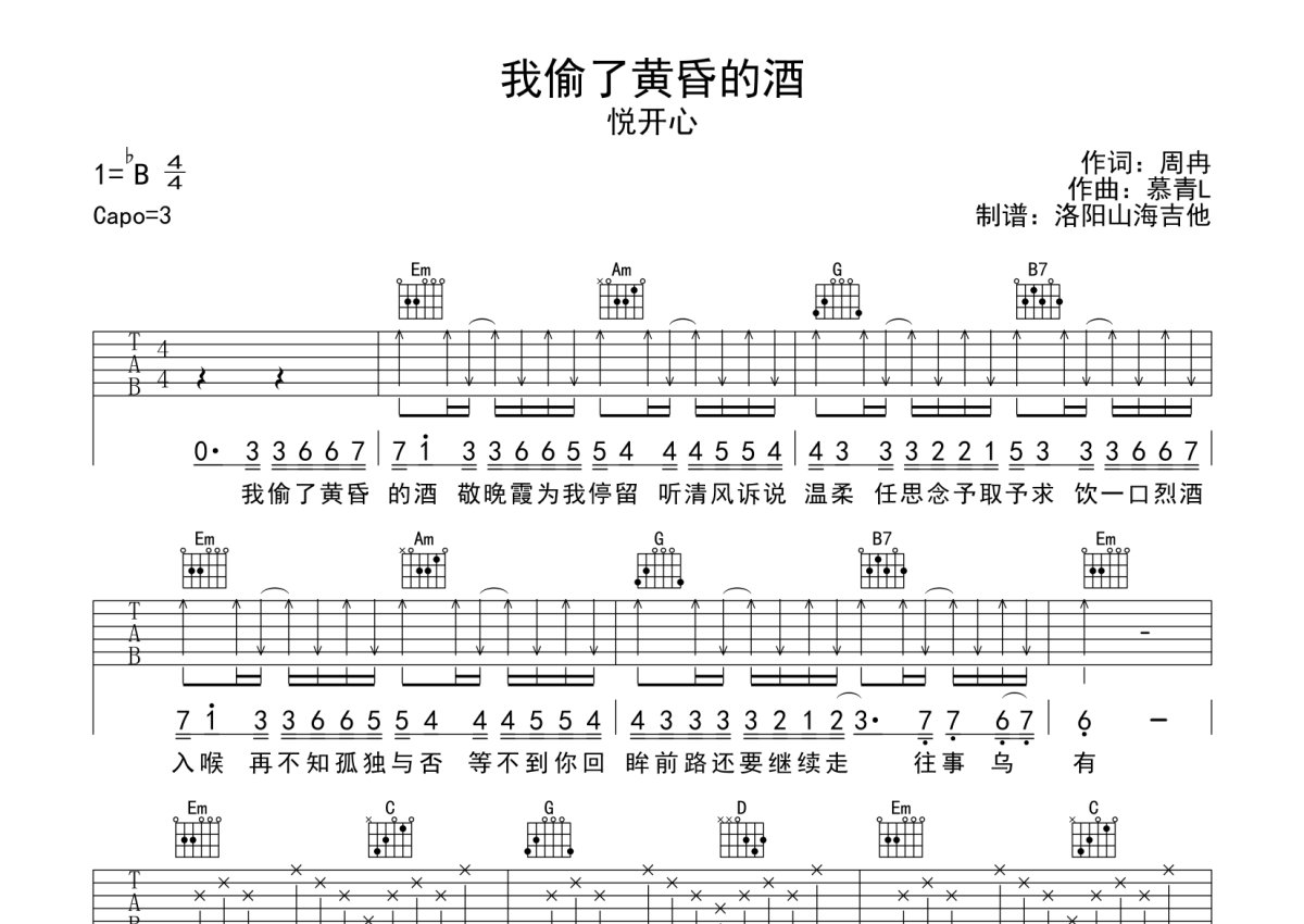 悦开心《我偷了黄昏的酒》吉他谱 - G调弹唱六线谱