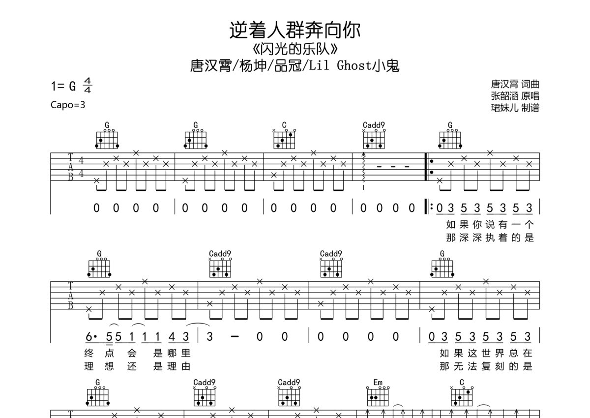 唐汉霄/杨坤/品冠/Lil Ghost小鬼《逆着人群奔向你 Live)》吉他谱 - G调弹唱六线谱