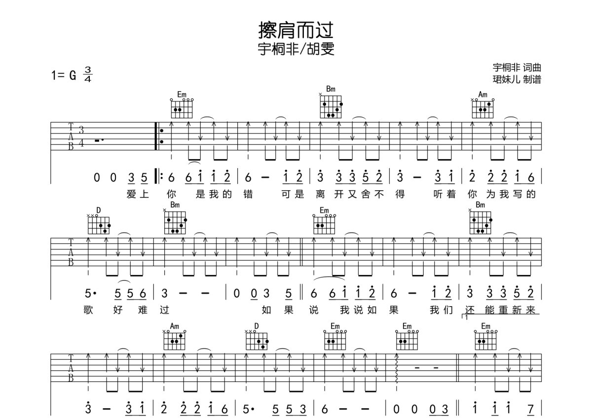 宇桐非/胡雯《擦肩而过》吉他谱 - G调弹唱六线谱