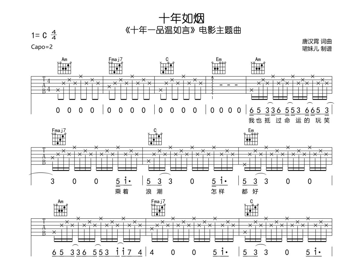 《十年如烟》是郁可唯演唱的一首歌曲,本吉他谱采用的是C调指法编配,这份吉他谱共有三张高清图谱,图谱由 @珺妹儿 编配上传,图谱使用六线谱编配,包含吉他和弦指法、简谱以及歌词部分,使用这份十年如烟吉他谱,可以让你更加方便地掌握这首歌曲的弹唱技巧,快来尝试吧。《十年一品温如言》电影主题曲,本谱采用C调指法编配,弹唱建议变调夹2品,速度75BPM,难度较简单,易上手。
