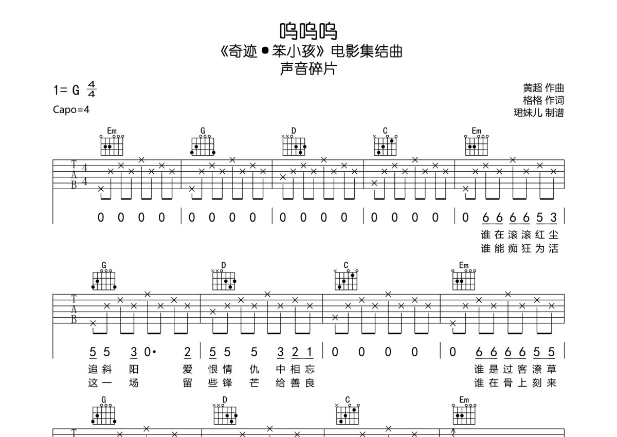 声音碎片《呜呜呜》吉他谱 - G调弹唱六线谱