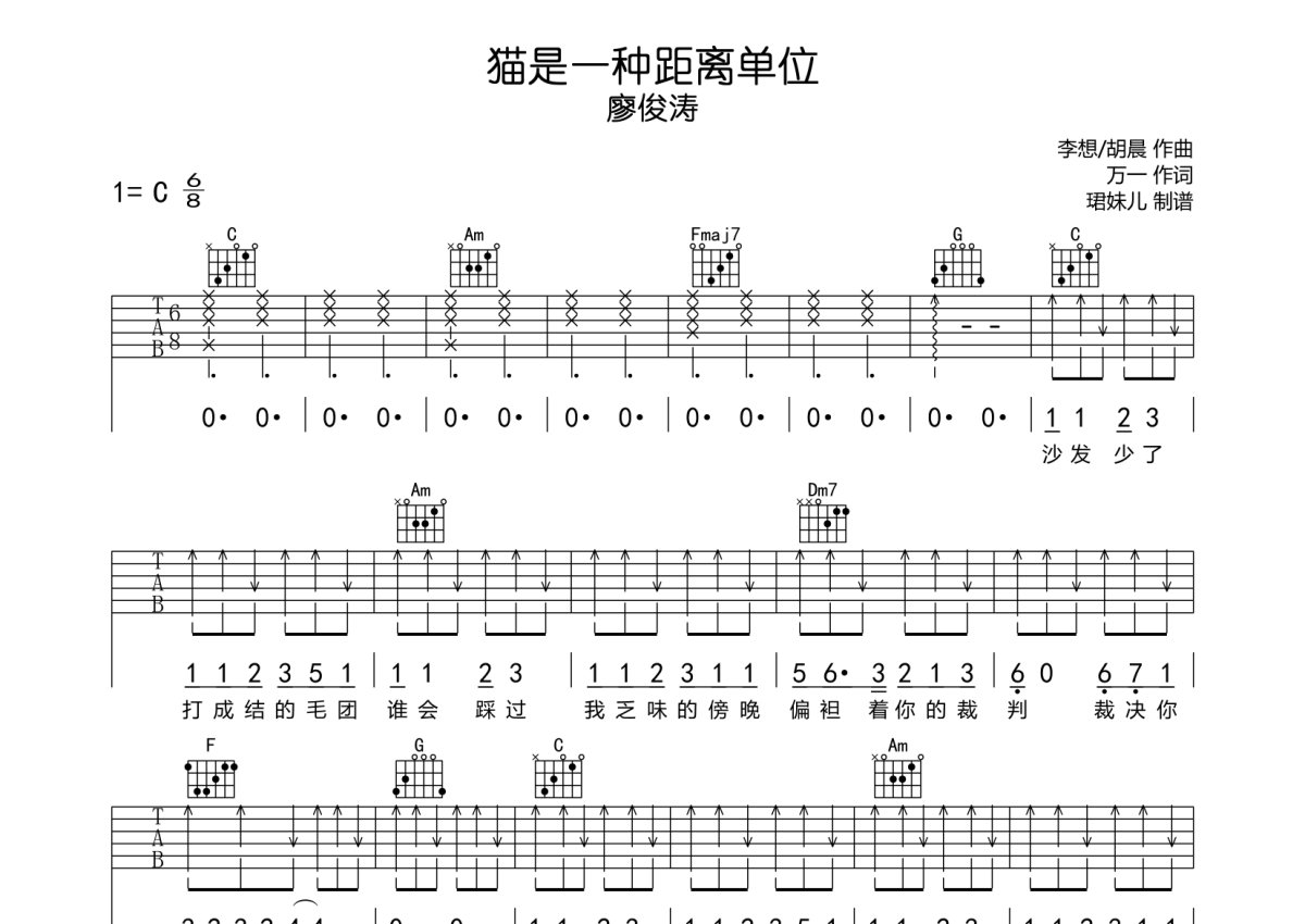 廖俊涛《猫是一种距离单位》吉他谱 - C调弹唱六线谱