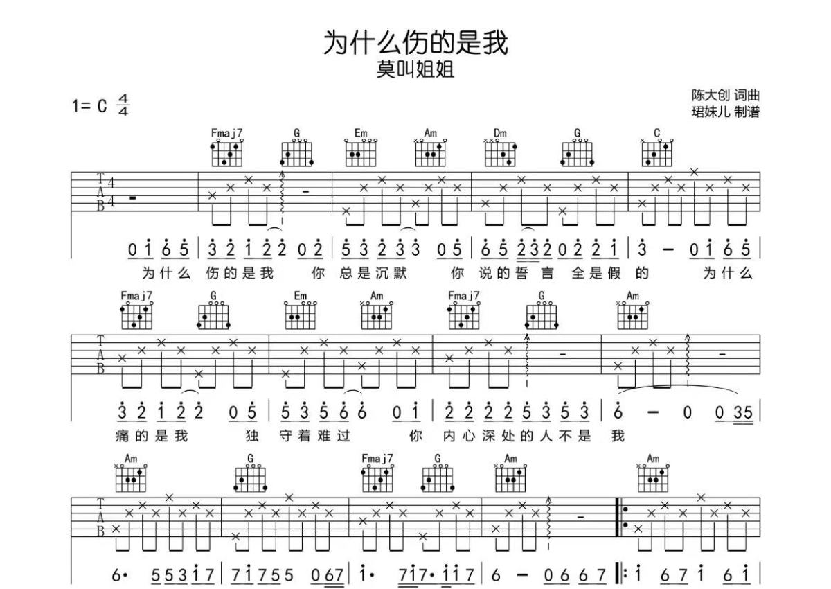 莫叫姐姐《为什么伤的是我》吉他谱 - C调弹唱六线谱