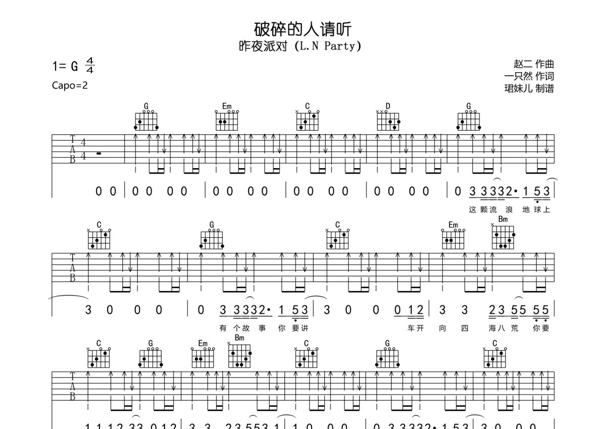 昨夜派对(L.N Party)《破碎的人请听》吉他谱 - G调弹唱六线谱