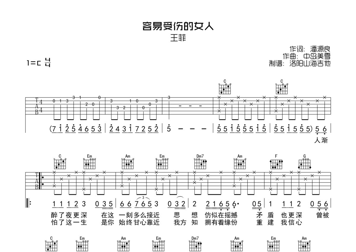 王菲《容易受伤的女人》吉他谱 - C调弹唱六线谱