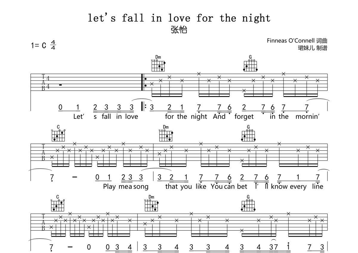 张怡《let's fall in love for the night》吉他谱 - C调弹唱六线谱