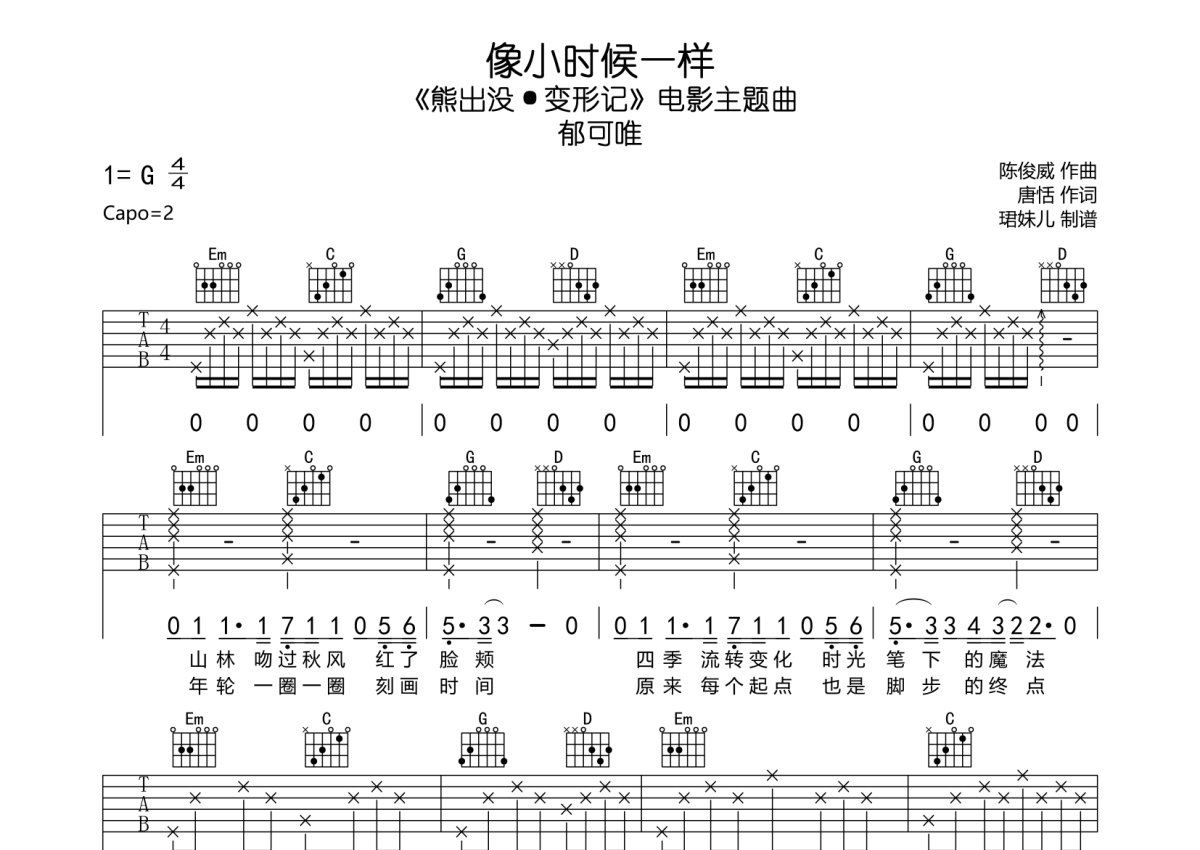 郁可唯《像小时候一样》吉他谱 - G调弹唱六线谱