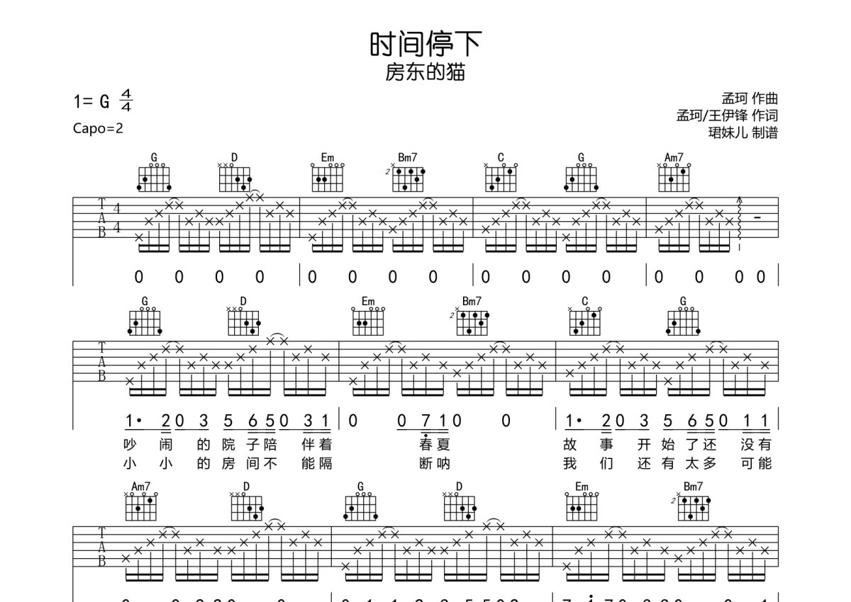 房东的猫《时间停下》吉他谱 - G调弹唱六线谱