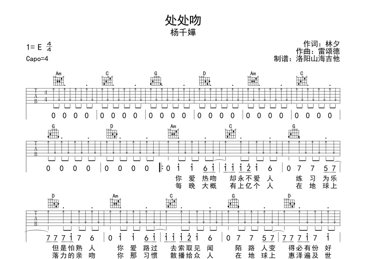 杨千嬅《处处吻》吉他谱 - C调弹唱六线谱