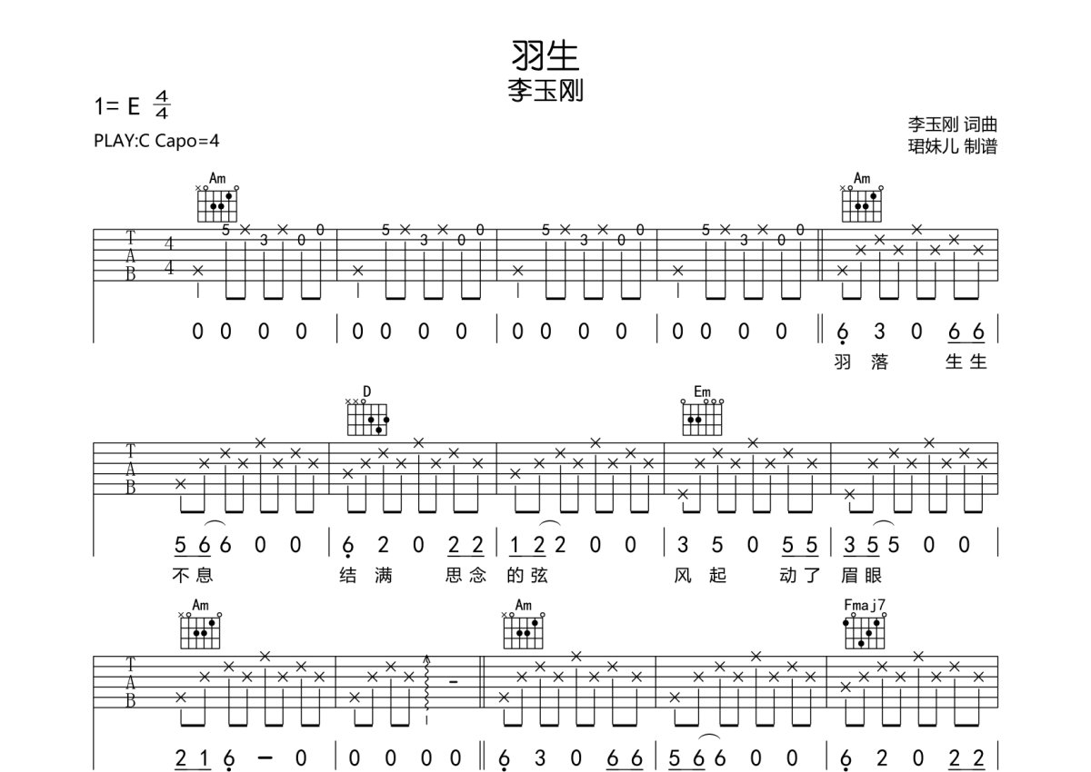 李玉刚《羽生》吉他谱 - C调弹唱六线谱