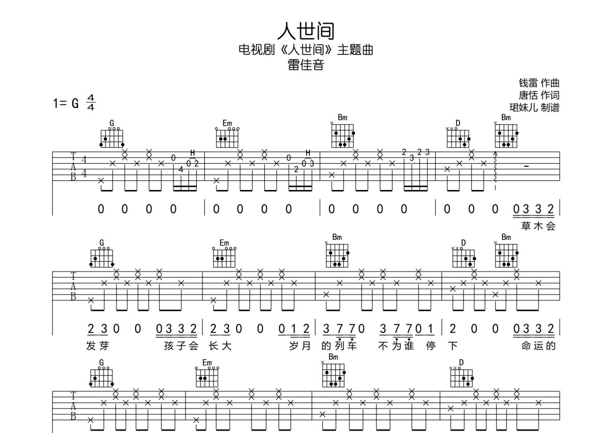 雷佳音《人世间》吉他谱 - G调弹唱六线谱