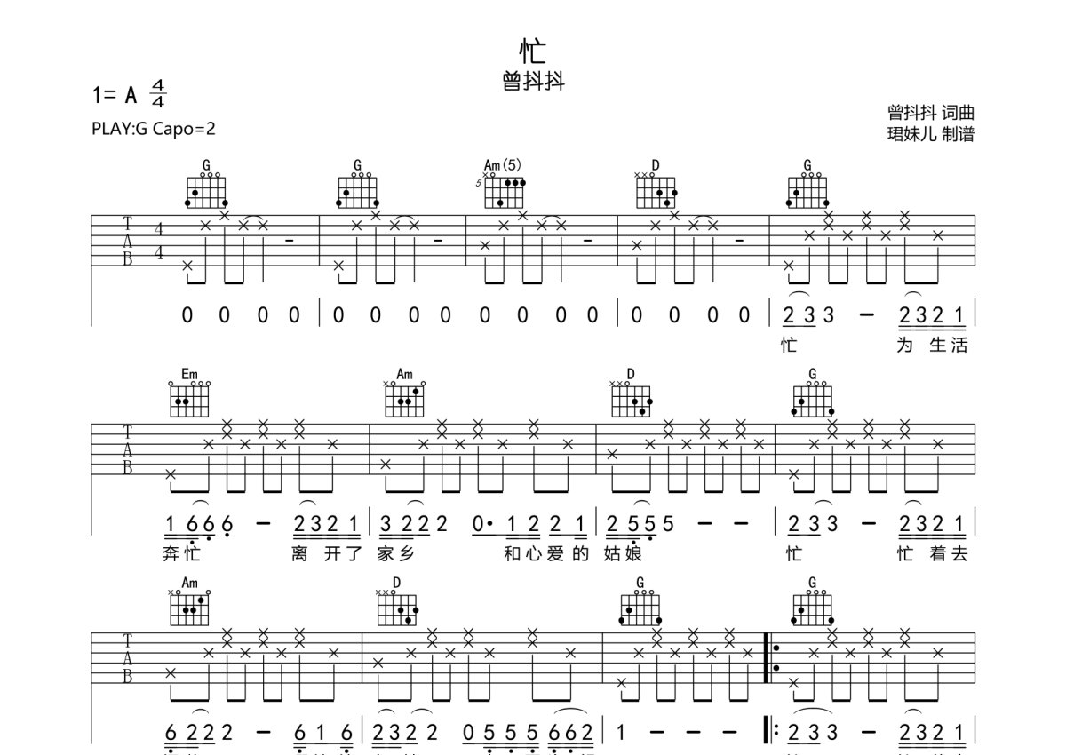 曾抖抖《忙》吉他谱 - G调弹唱六线谱
