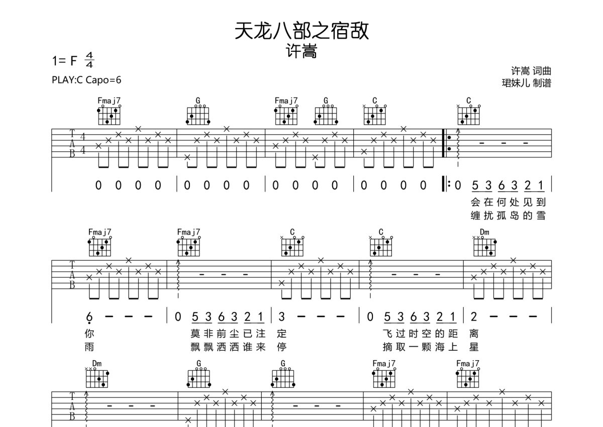 许嵩《天龙八部之宿敌》吉他谱 - C调弹唱六线谱