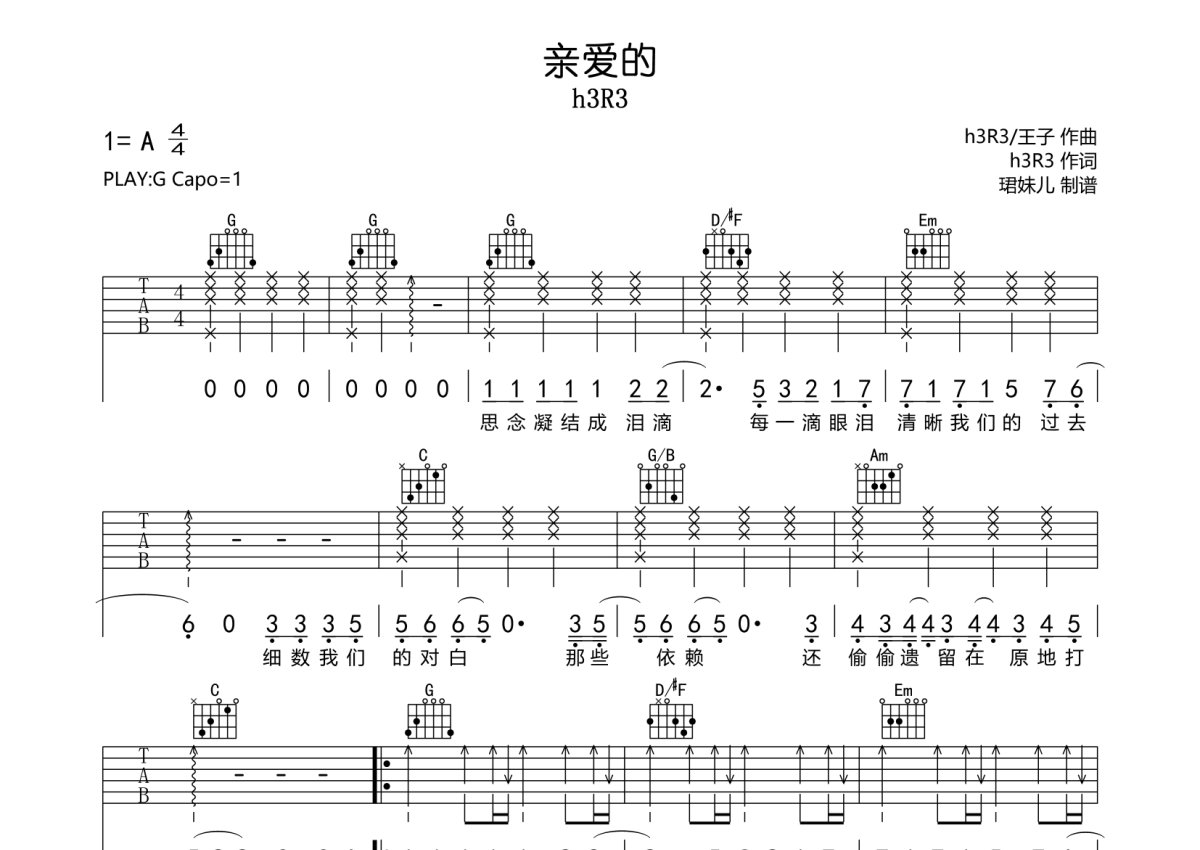 h3R3《亲爱的》吉他谱 - G调弹唱六线谱