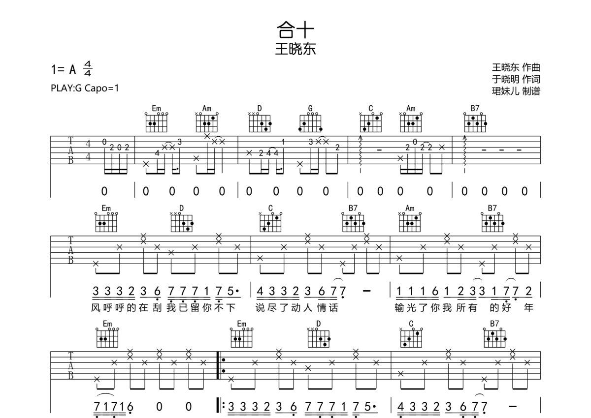 王晓东《合十》吉他谱 - G调弹唱六线谱