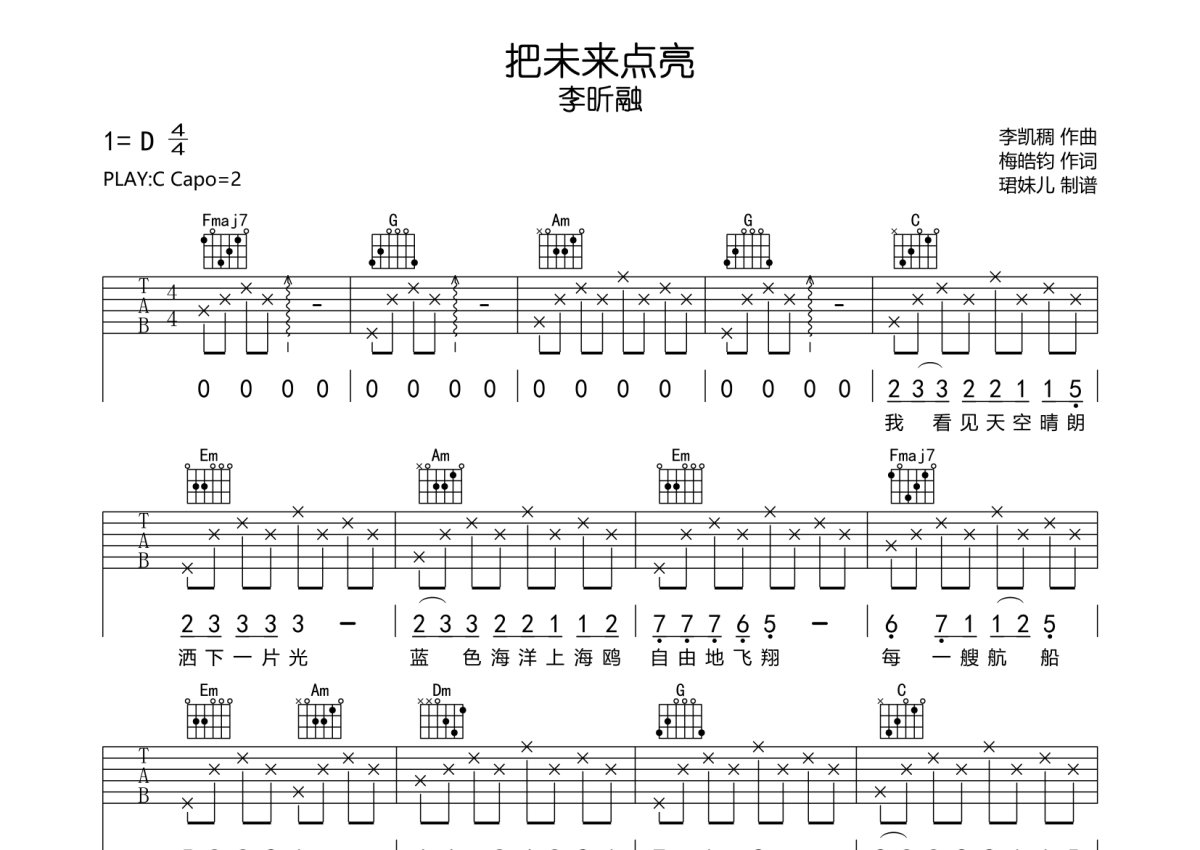 《把未来点亮》是李昕融演唱的一首歌曲,本吉他谱采用的是C调指法编配,这份吉他谱共有四张高清图谱,图谱由 @珺妹儿 编配上传,图谱使用六线谱编配,包含吉他和弦指法、简谱以及歌词部分,使用这份把未来点亮吉他谱,可以让你更加方便地掌握这首歌曲的弹唱技巧,快来尝试吧。本谱采用C调指法编配,弹唱建议变调夹2品,速度85BPM,难度较简单,易上手。