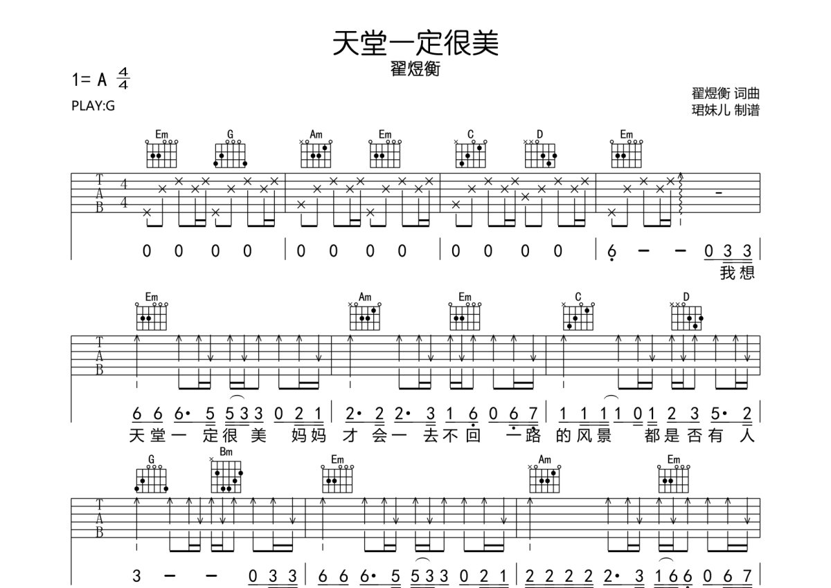 翟煜衡《天堂一定很美》吉他谱 - G调弹唱六线谱
