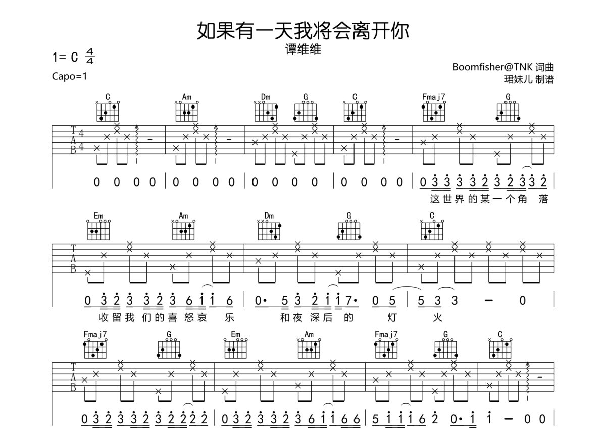 谭维维《如果有一天我将会离开你》吉他谱 - C调弹唱六线谱