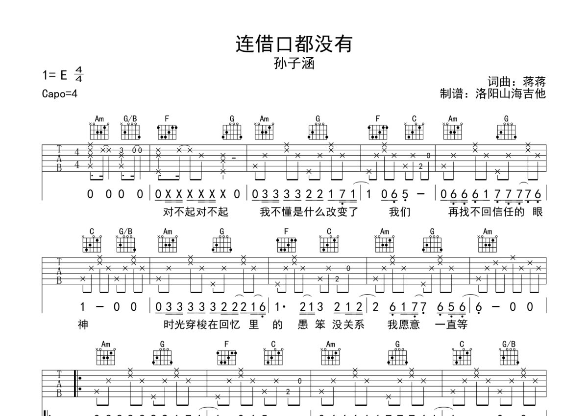 《连借口都没有》是孙子涵演唱的一首歌曲,本吉他谱采用的是C调指法编配,这份吉他谱共有两张高清图谱,图谱由 @何奔洋 编配上传,图谱使用六线谱编配,包含吉他和弦指法、简谱以及歌词部分,使用这份连借口都没有吉他谱,可以让你更加方便地掌握这首歌曲的弹唱技巧,快来尝试吧。