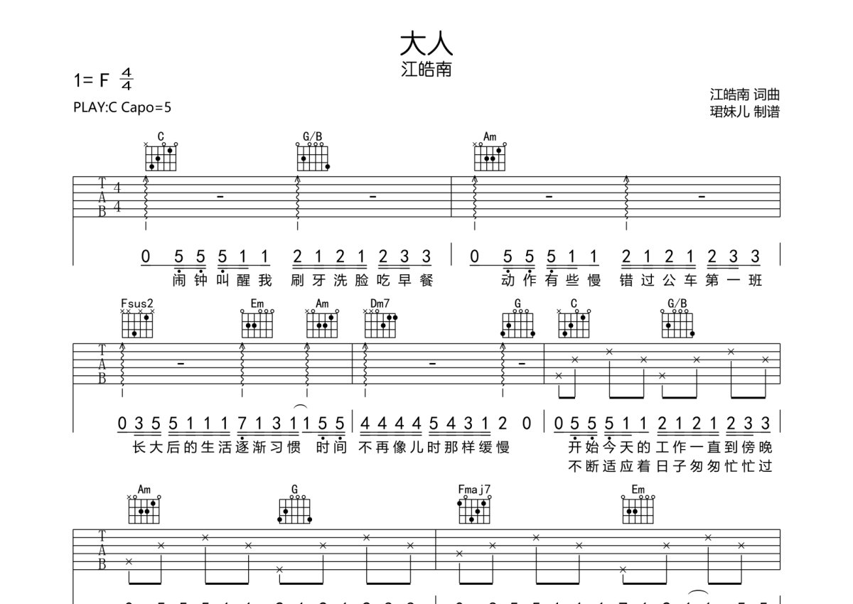 江皓南《大人》吉他谱 - C调弹唱六线谱