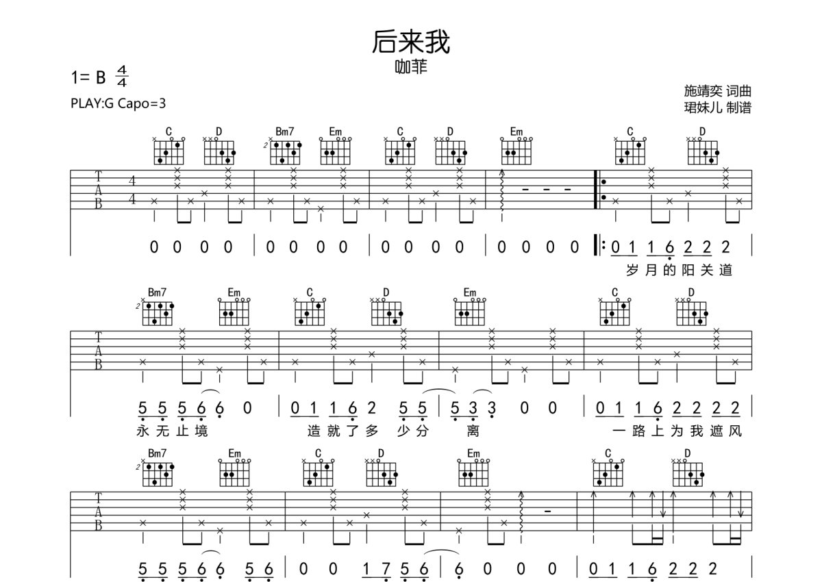 《后来我》是咖菲演唱的一首歌曲,本吉他谱采用的是G调指法编配,这份吉他谱共有两张高清图谱,图谱由 @珺妹儿 编配上传,图谱使用六线谱编配,包含吉他和弦指法、简谱以及歌词部分,使用这份后来我吉他谱,可以让你更加方便地掌握这首歌曲的弹唱技巧,快来尝试吧。本谱采用G调指法编配,弹唱建议变调夹3品,速度90BPM,难度较简单,易上手。