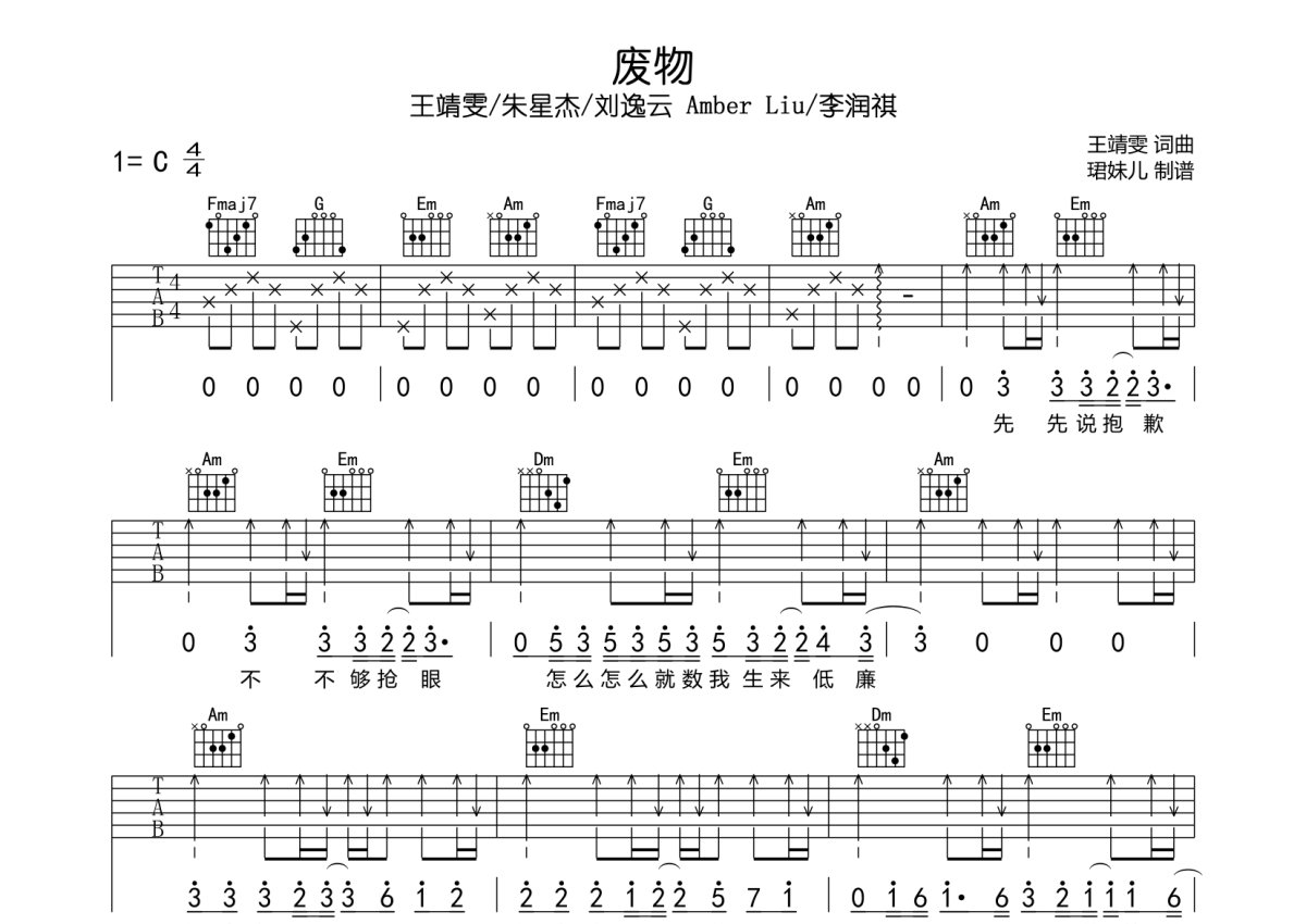 王靖雯/朱星杰/刘逸云 Amber Liu/李润祺《废物》吉他谱 - C调弹唱六线谱