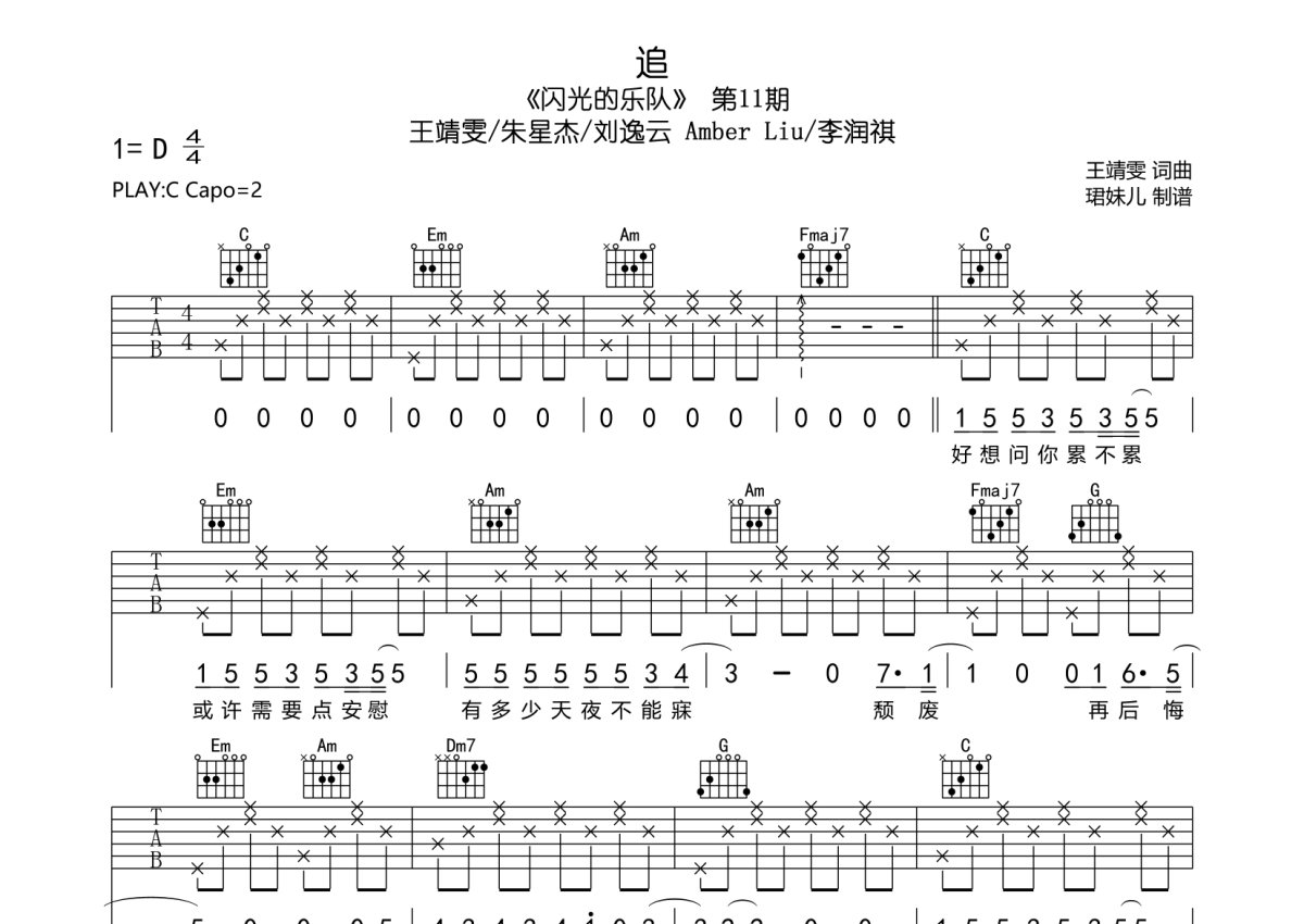 王靖雯/朱星杰/刘逸云 Amber Liu/李润祺《追》吉他谱 - C调弹唱六线谱