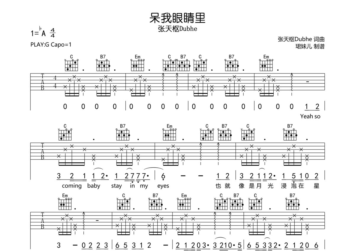 张天枢Dubhe《呆我眼睛里》吉他谱 - G调弹唱六线谱
