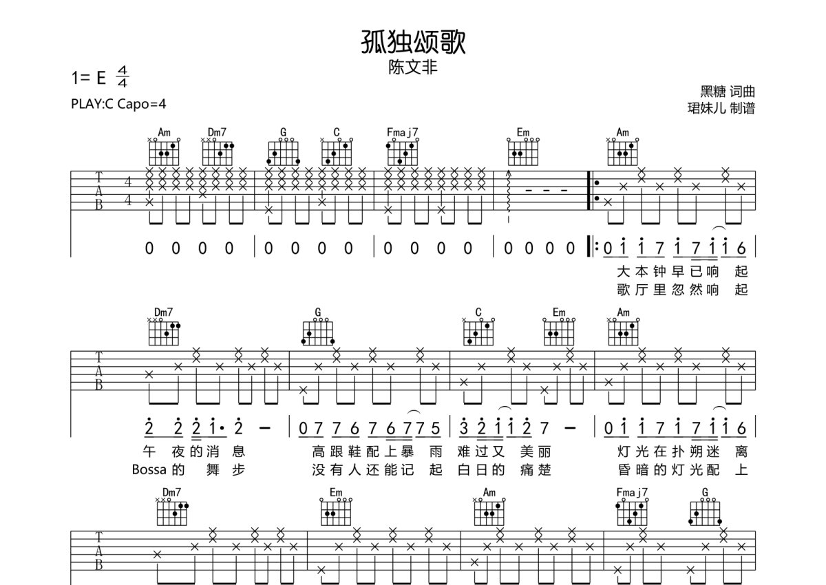 陈文非《孤独颂歌》吉他谱 - C调弹唱六线谱