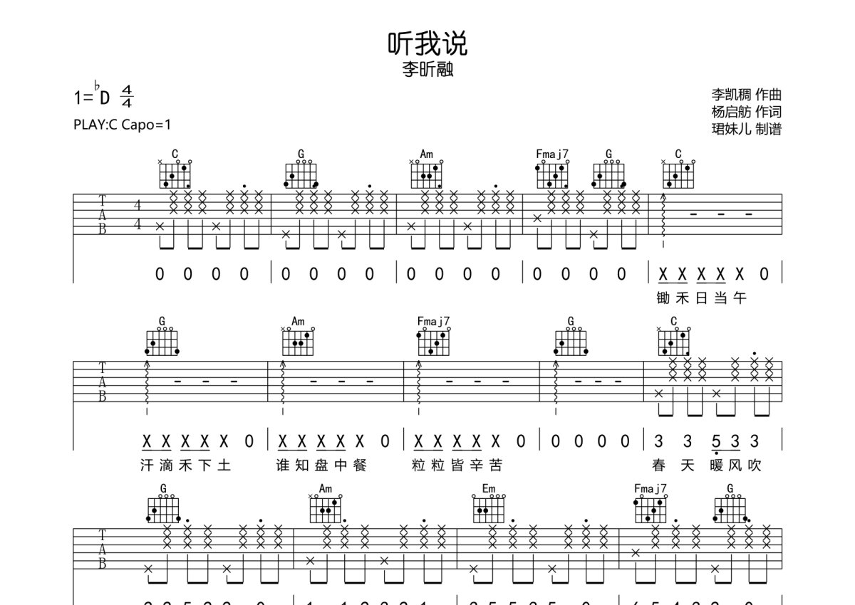 《听我说》是李昕融演唱的一首歌曲,本吉他谱采用的是C调指法编配,这份吉他谱共有三张高清图谱,图谱由 @珺妹儿 编配上传,图谱使用六线谱编配,包含吉他和弦指法、简谱以及歌词部分,使用这份听我说吉他谱,可以让你更加方便地掌握这首歌曲的弹唱技巧,快来尝试吧。本谱采用C调指法编配,弹唱建议变调夹1品,速度90BPM,难度较简单,易上手。