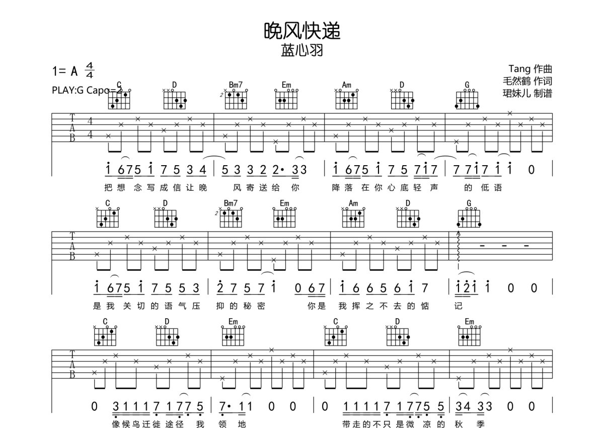 蓝心羽《晚风快递》吉他谱 - G调弹唱六线谱