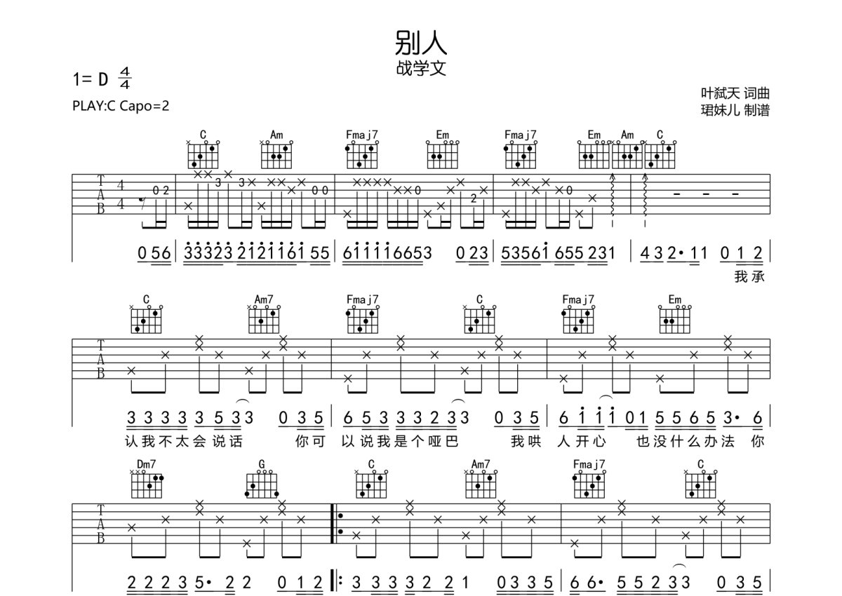 《别人》是战学文演唱的一首歌曲,本吉他谱采用的是C调指法编配,这份吉他谱共有两张高清图谱,图谱由 @珺妹儿 编配上传,图谱使用六线谱编配,包含吉他和弦指法、简谱以及歌词部分,使用这份别人吉他谱,可以让你更加方便地掌握这首歌曲的弹唱技巧,快来尝试吧。唱作人战学文新歌《别人》,叶弑天词曲创作。我,是一个不懂表达的人我不会甜言蜜语,不会讨人欢心我的木讷甚至会惹你不悦或许,别人会送你鲜花或许,别人会贴心送你回家或许,别人会做更多懂你心思的事情但我在用我最笨拙的方式表达着我心里的爱可不可以,把我也当成别人,让我来学着做这些那些的事情不要轻易的放弃我,好吗?。