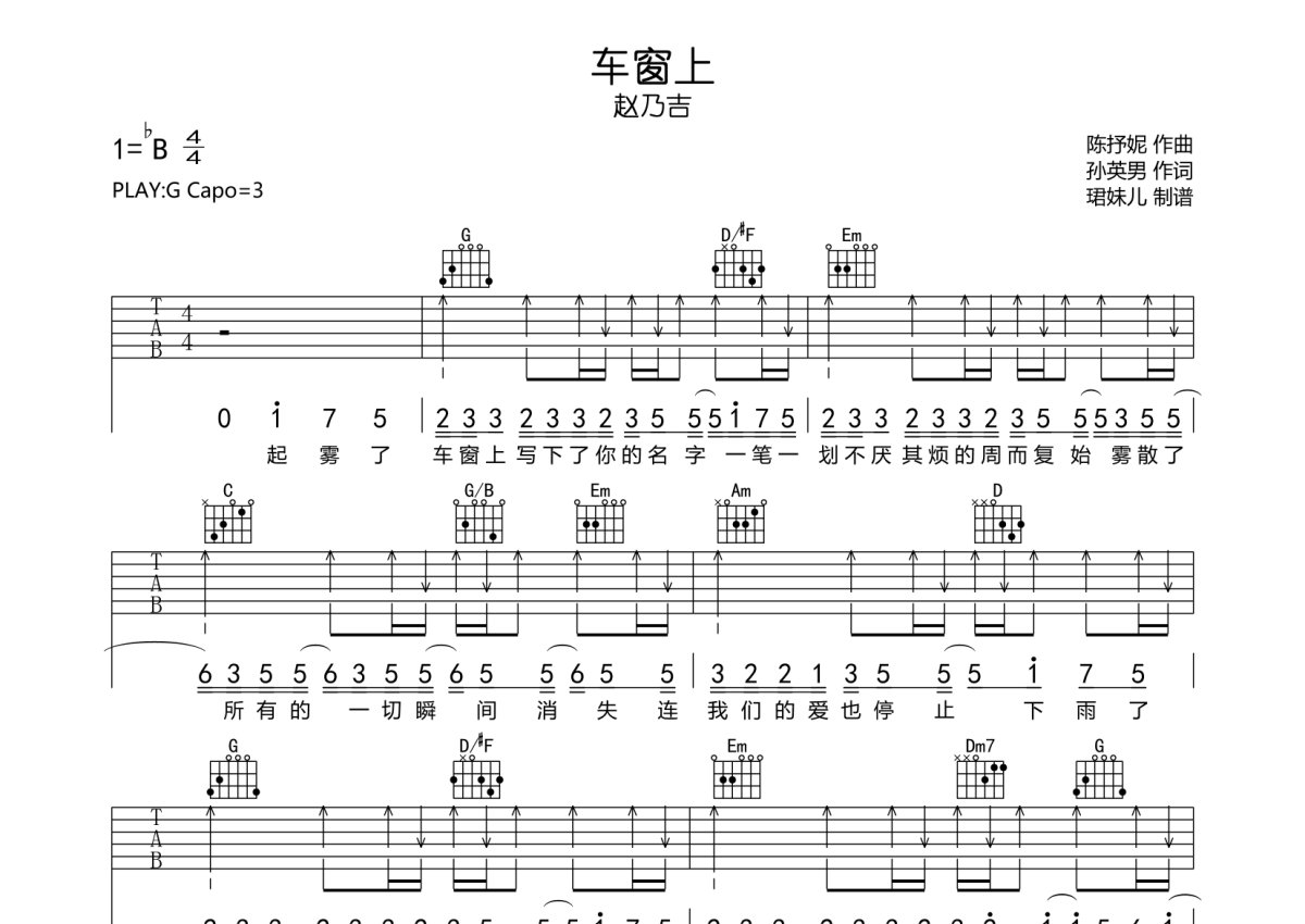 赵乃吉《车窗上》吉他谱 - G调弹唱六线谱