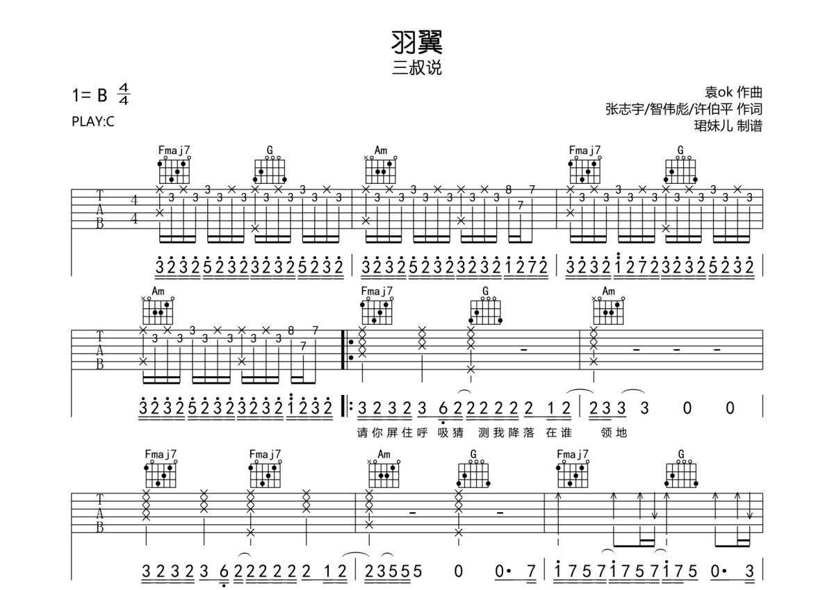 《羽翼》是三叔说演唱的一首歌曲,本吉他谱采用的是C调指法编配,这份吉他谱共有两张高清图谱,图谱由 @珺妹儿 编配上传,图谱使用六线谱编配,包含吉他和弦指法、简谱以及歌词部分,使用这份羽翼吉他谱,可以让你更加方便地掌握这首歌曲的弹唱技巧,快来尝试吧。本谱采用C调指法编配,速度85BPM,难度较简单,易上手。