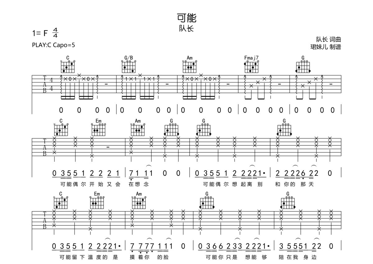 《可能》是队长演唱的一首歌曲,本吉他谱采用的是C调指法编配,这份吉他谱共有两张高清图谱,图谱由 @珺妹儿 编配上传,图谱使用六线谱编配,包含吉他和弦指法、简谱以及歌词部分,使用这份可能吉他谱,可以让你更加方便地掌握这首歌曲的弹唱技巧,快来尝试吧。本谱采用C调指法编配,弹唱建议变调夹5品,速度85BPM,难度较简单,易上手。