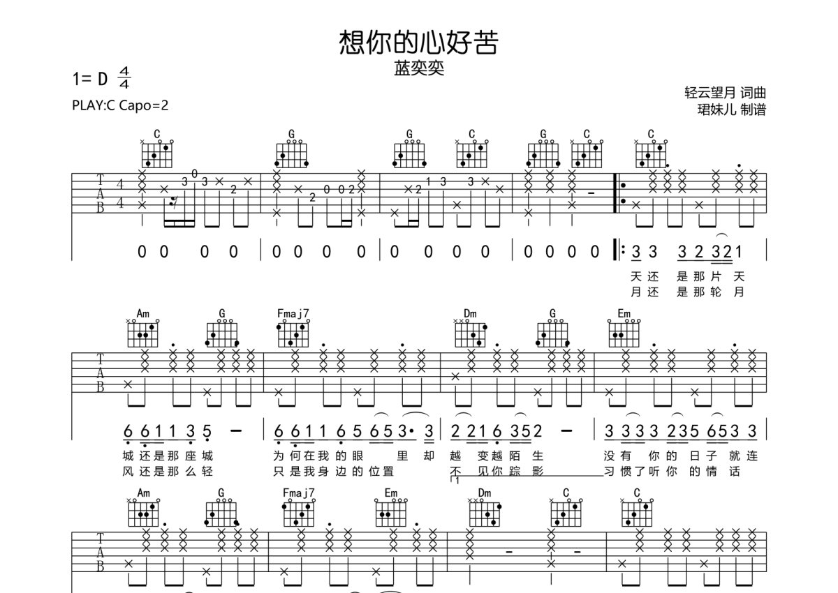 蓝奕奕《想你的心好苦》吉他谱 - C调弹唱六线谱