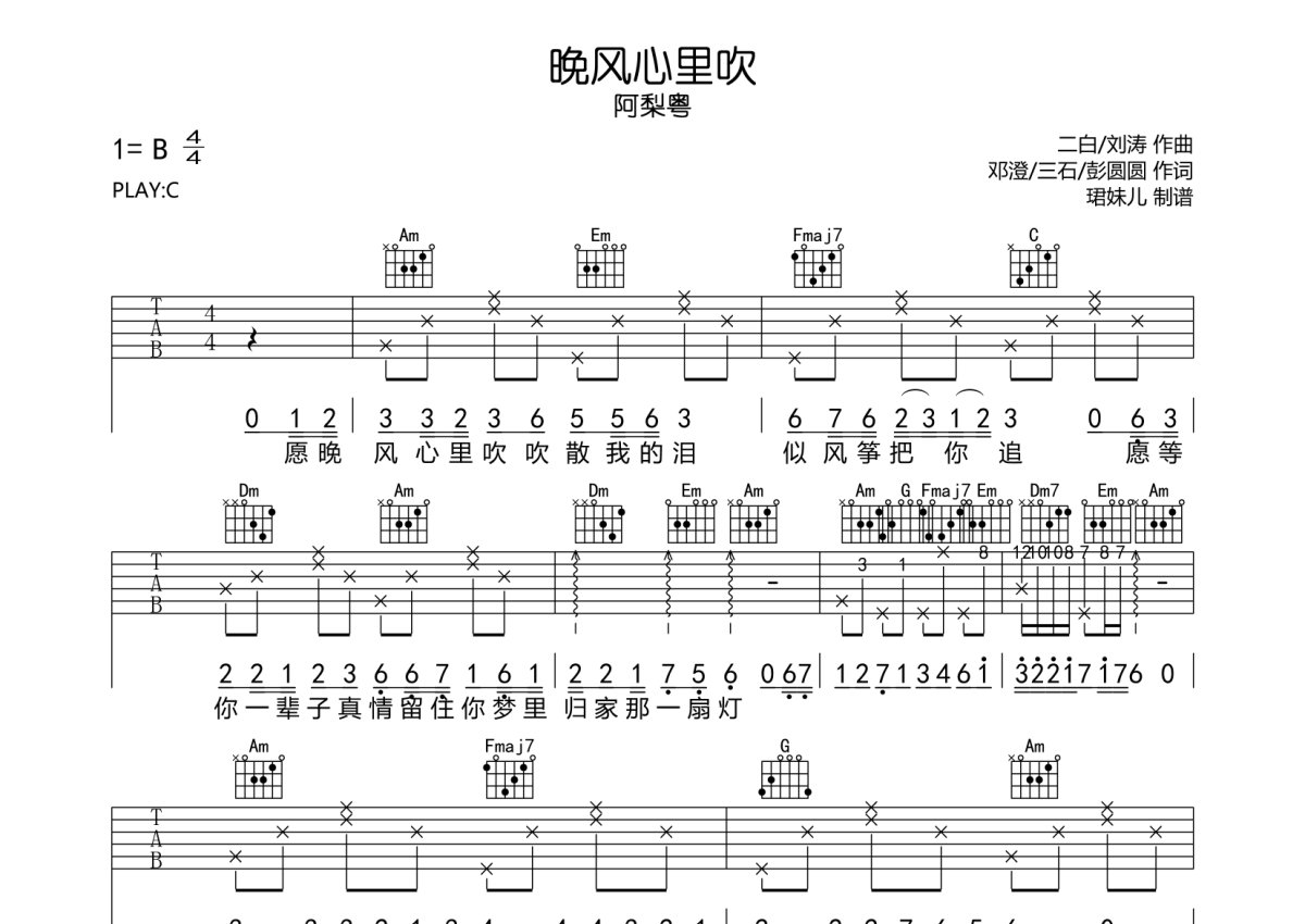 阿梨粤《晚风心里吹》吉他谱 - C调弹唱六线谱