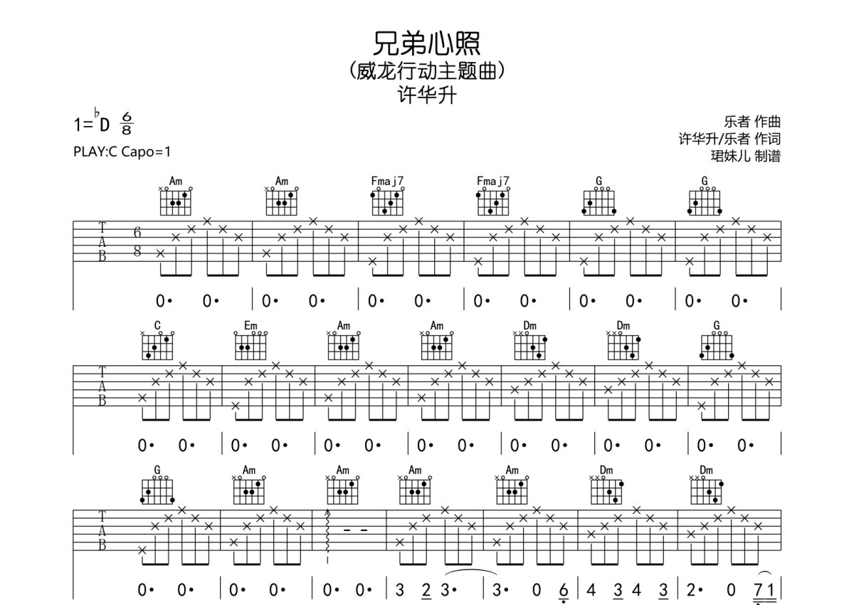 《兄弟心照》是许华升演唱的一首歌曲,本吉他谱采用的是C调指法编配,这份吉他谱共有两张高清图谱,图谱由 @珺妹儿 编配上传,图谱使用六线谱编配,包含吉他和弦指法、简谱以及歌词部分,使用这份兄弟心照吉他谱,可以让你更加方便地掌握这首歌曲的弹唱技巧,快来尝试吧。威龙行动主题曲,本谱采用C调指法编配,弹唱建议变调夹1品,速度95BPM,难度较简单,易上手。