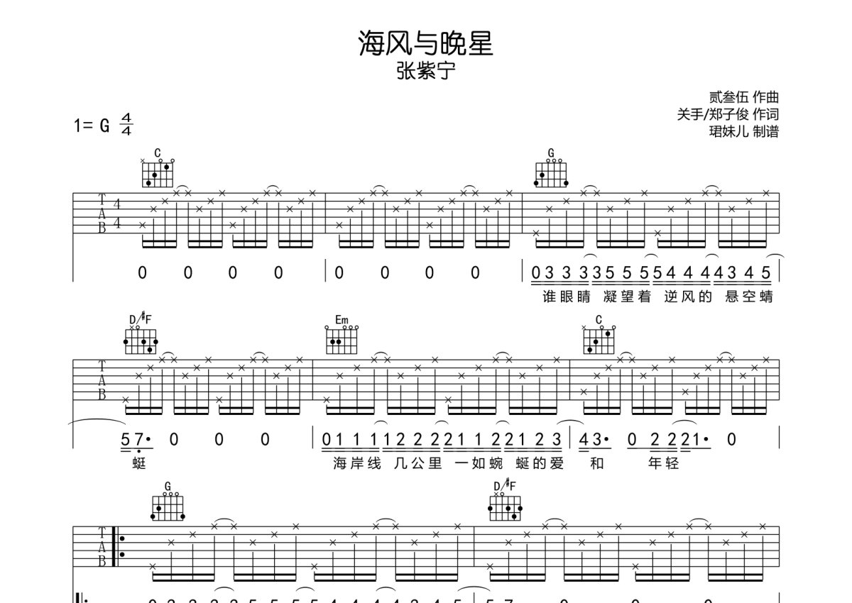 《海风与晚星》是张紫宁演唱的一首歌曲,本吉他谱采用的是G调指法编配,这份吉他谱共有三张高清图谱,图谱由 @珺妹儿 编配上传,图谱使用六线谱编配,包含吉他和弦指法、简谱以及歌词部分,使用这份海风与晚星吉他谱,可以让你更加方便地掌握这首歌曲的弹唱技巧,快来尝试吧。本谱采用G调指法编配,速度85BPM,难度较简单,易上手。《海风与晚星》由关手、郑子俊作词,贰叁伍作曲,歌手张紫宁实力演唱。温柔婉转的嗓音,诉说着专属于那个时光的故事。热烈明媚的夏夜,海风吹亮晚星,我只想吻你,让时光暂停。 海风与晚星,如歌曲的名字一样,在歌曲隐约的回响中勾勒出碧蓝的海岸线,细腻的歌声犹如夏季的海风沁人心脾,犹如置身在潮涨潮落的海边,观赏着浩瀚的月色与星光,让人想在温柔的春夏之际来一场浪漫地邂逅,在歌曲中肆意享受着青春的气息。