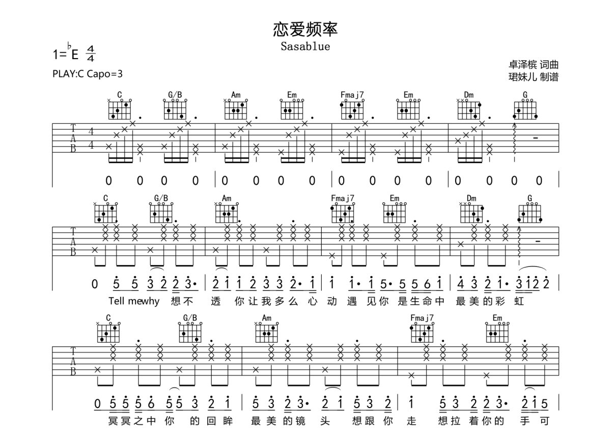Sasablue《恋爱频率》吉他谱 - C调弹唱六线谱