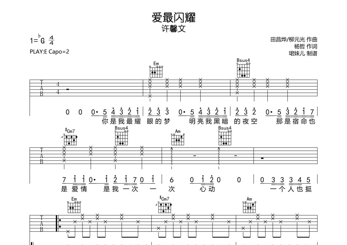 《爱最闪耀》是许馨文演唱的一首歌曲,本吉他谱采用的是E调指法编配,这份吉他谱共有两张高清图谱,图谱由 @珺妹儿 编配上传,图谱使用六线谱编配,包含吉他和弦指法、简谱以及歌词部分,使用这份爱最闪耀吉他谱,可以让你更加方便地掌握这首歌曲的弹唱技巧,快来尝试吧。本谱采用E调指法编配,弹唱建议变调夹2品,速度85BPM,难度较简单,易上手。
