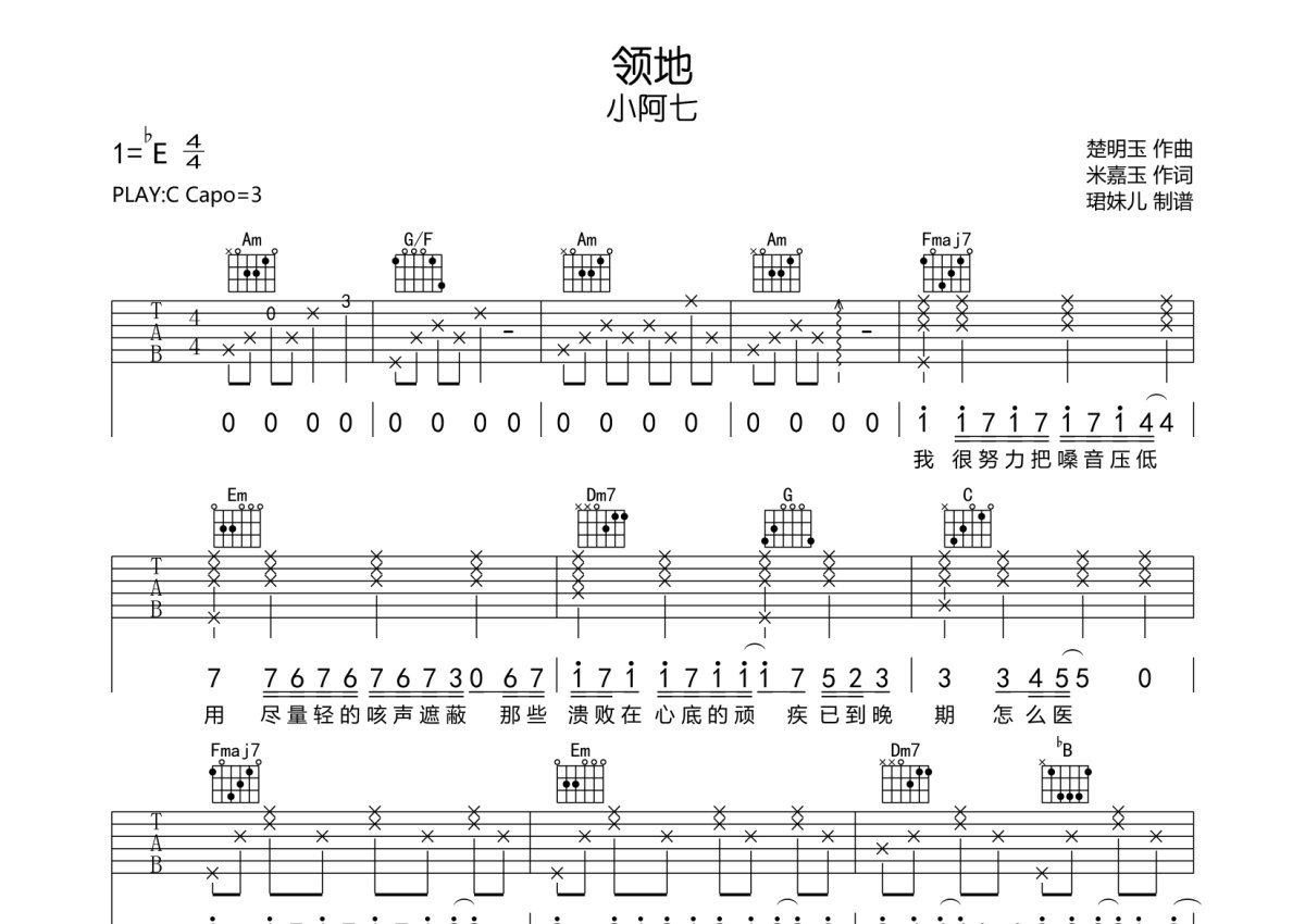 小阿七《领地》吉他谱 - C调弹唱六线谱