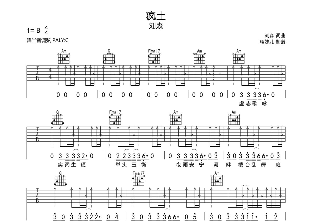 刘森《疯土》吉他谱 - C调弹唱六线谱