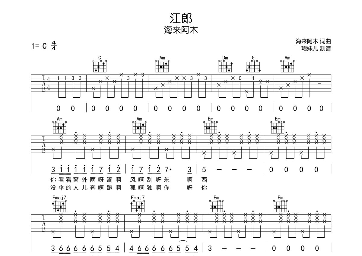 海来阿木《江郎》吉他谱 - C调弹唱六线谱