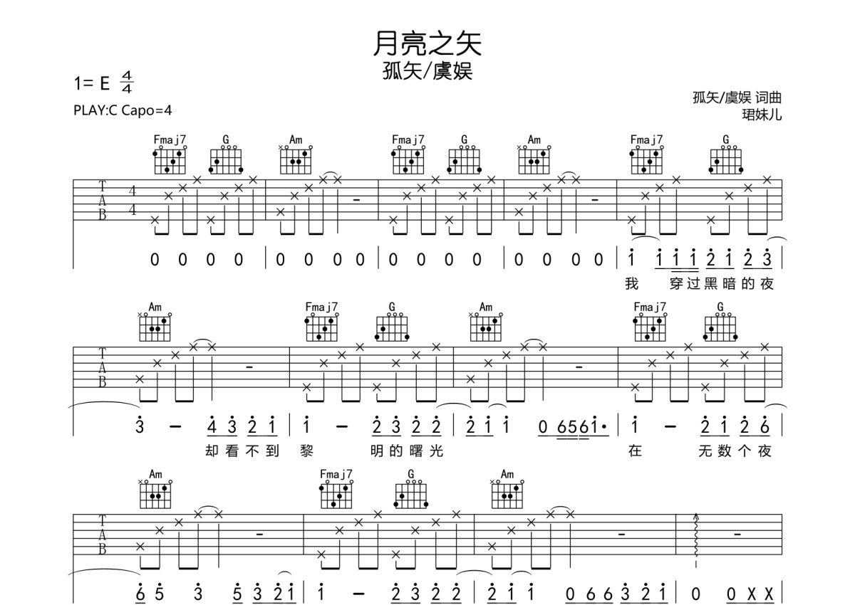 孤矢/虞娱《月亮之矢》吉他谱 - C调弹唱六线谱
