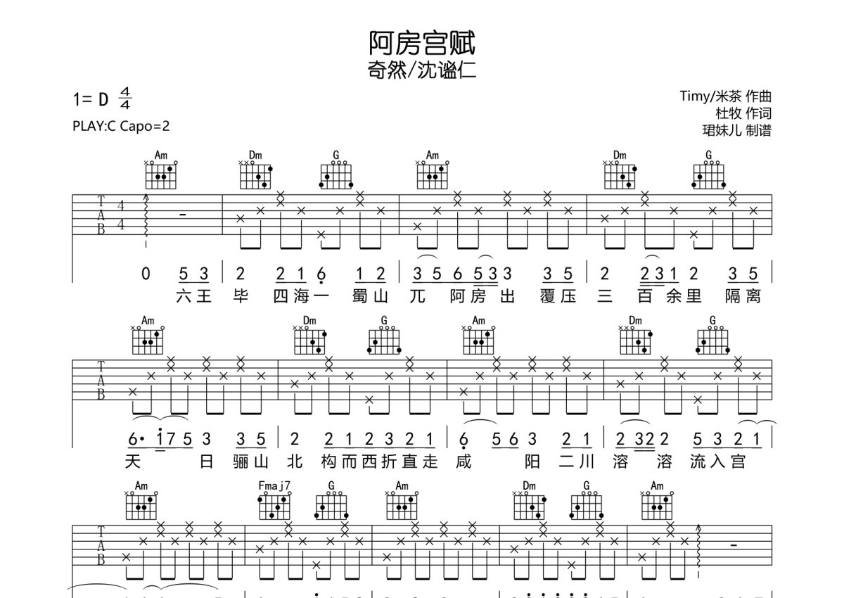 《阿房宫赋》是奇然/沈谧仁演唱的一首歌曲,本吉他谱采用的是C调指法编配,这份吉他谱共有五张高清图谱,图谱由 @珺妹儿 编配上传,图谱使用六线谱编配,包含吉他和弦指法、简谱以及歌词部分,使用这份阿房宫赋吉他谱,可以让你更加方便地掌握这首歌曲的弹唱技巧,快来尝试吧。本谱采用C调指法编配,弹唱建议变调夹2品,速度85BPM,难度较简单,易上手。