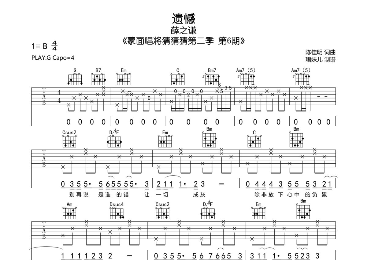 《遗憾》是薛之谦演唱的一首歌曲,本吉他谱采用的是G调指法编配,这份吉他谱共有两张高清图谱,图谱由 @珺妹儿 编配上传,图谱使用六线谱编配,包含吉他和弦指法、简谱以及歌词部分,使用这份遗憾吉他谱,可以让你更加方便地掌握这首歌曲的弹唱技巧,快来尝试吧。蒙面唱将猜猜猜第二季 第6期,本谱采用G调指法编配,弹唱建议变调夹4品,速度85BPM,难度较简单,易上手。